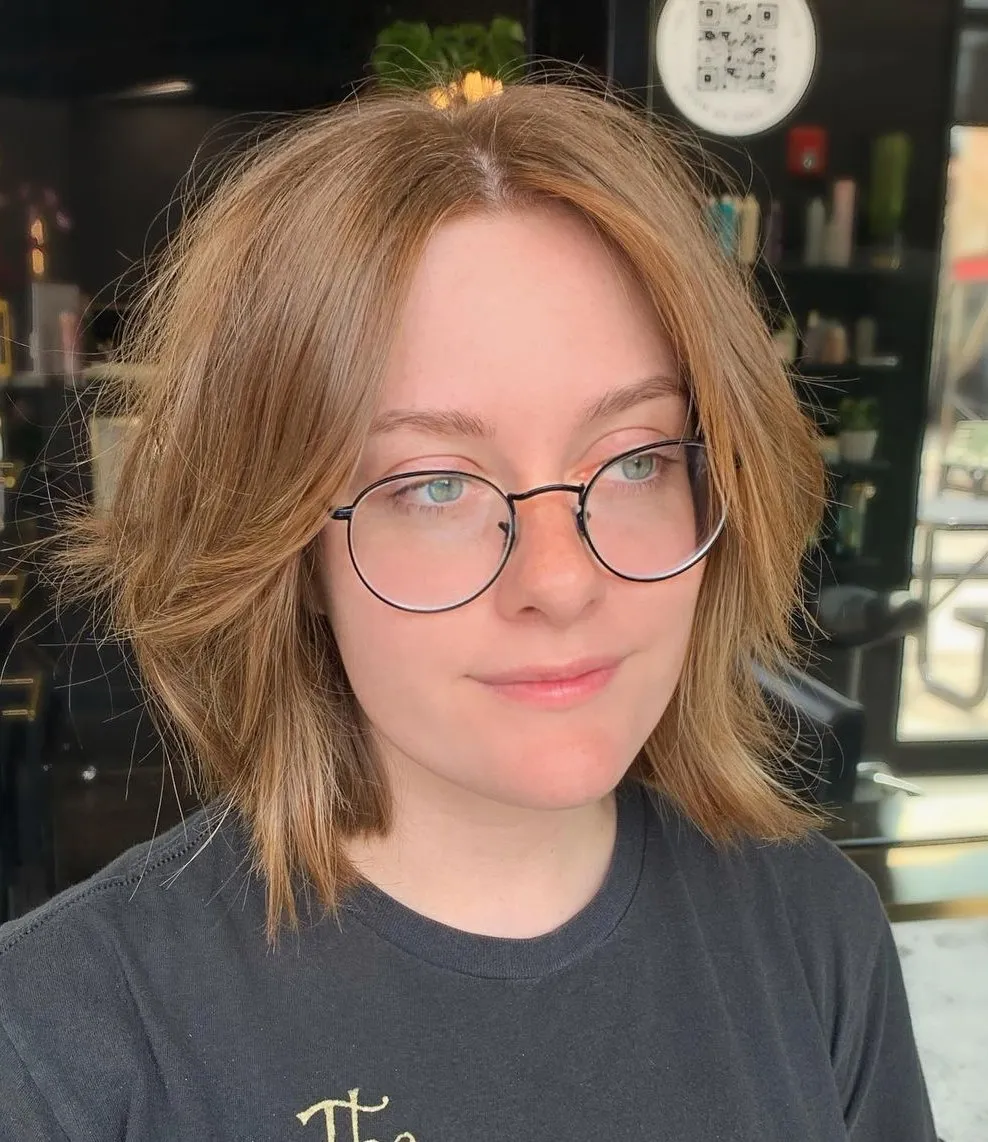 – Diese unordentliche „Bedhead“-Frisur ist lässig gestylt mit den leichtesten natürlichen Wellen und ergänzt den intelligenten Look einer runden Brille. Lange, geschichtete Ponyfransen umrahmen das Gesicht schön.